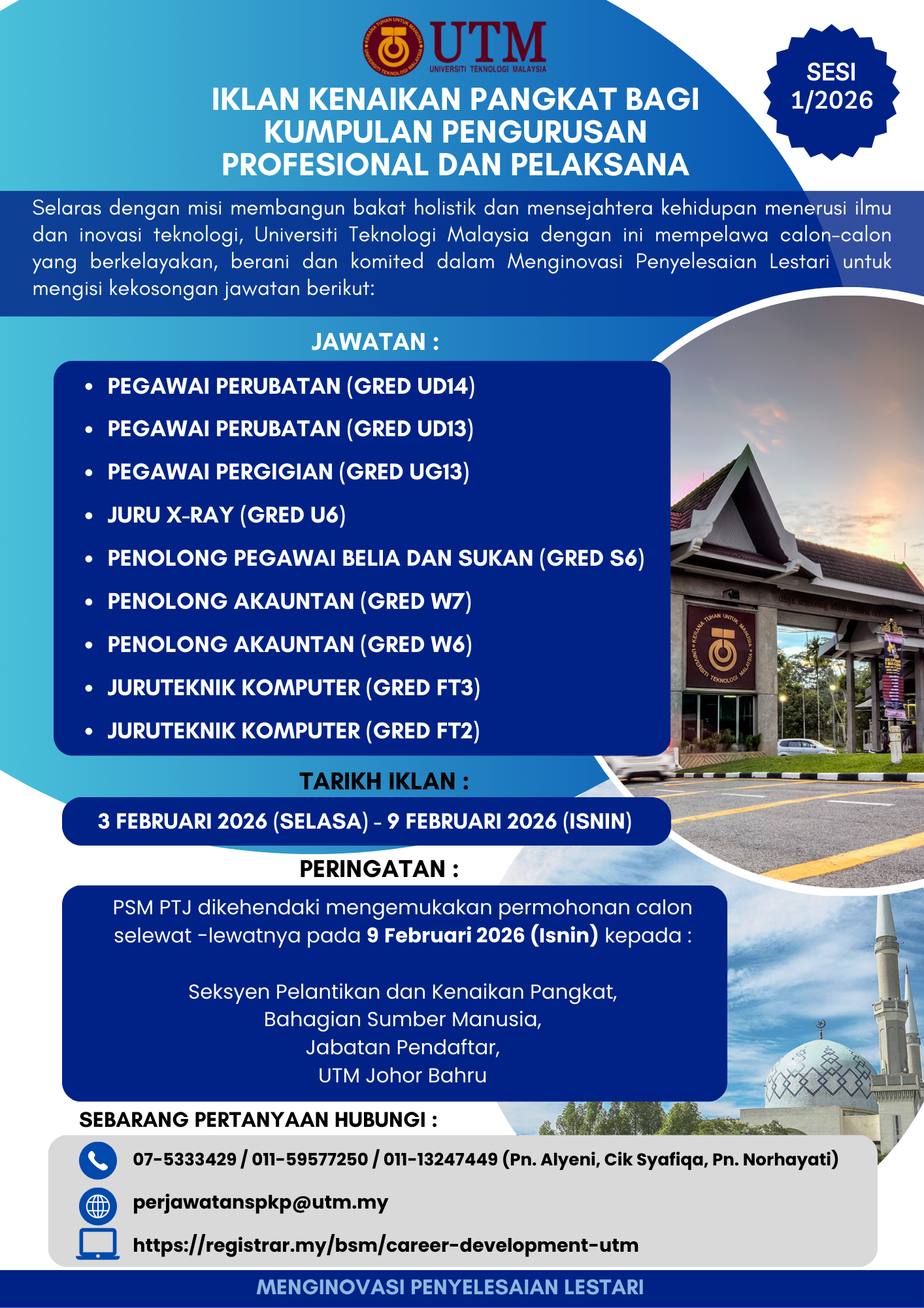 Sebarang pertanyaan boleh hubungi talian 07-5531228 (Puan Nur Farahin) di Bahagian Sumber Manusia, Jabatan Pendaftar, UTM Johor Bahru.